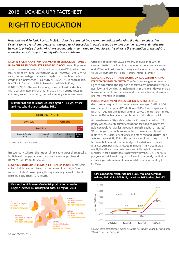 The factsheets demonstrate that gains in poverty reduction have been precarious and that the government’s plan to fast-track the country’s economic transformation and attain upper middle income status by 2040 pays inadequate attention to the social and economic rights of Uganda’s most vulnerable. Investment in areas critical for these rights remains low and allocated funding is often not spent effectively. This gravely undermines the quality of public services that most Ugandans rely on. For example, although primary education is free, schools receive a staggeringly low $2.50 per pupil per year. As a result, many students lack textbooks, writing space and even classrooms; in such circumstances it is not surprising that only three out of ten of children complete primary school. This has resulted in the unregulated growth of private actors in public service delivery with many negative impacts on economic, social and cultural rights.