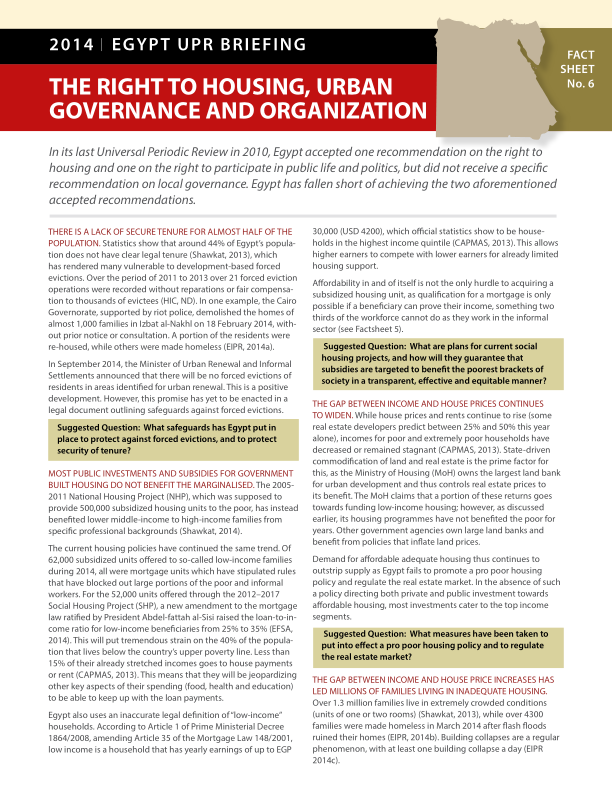 Egypt will be called upon to justify these "tough choices" and their impact on the rights of the Egyptian people when it appears before the 20th Session of the Human Rights Council's Universal Periodic Review Working Group in November 2014. In light of this appearance, CESR and its partners have prepared a series of short briefing papers on:
