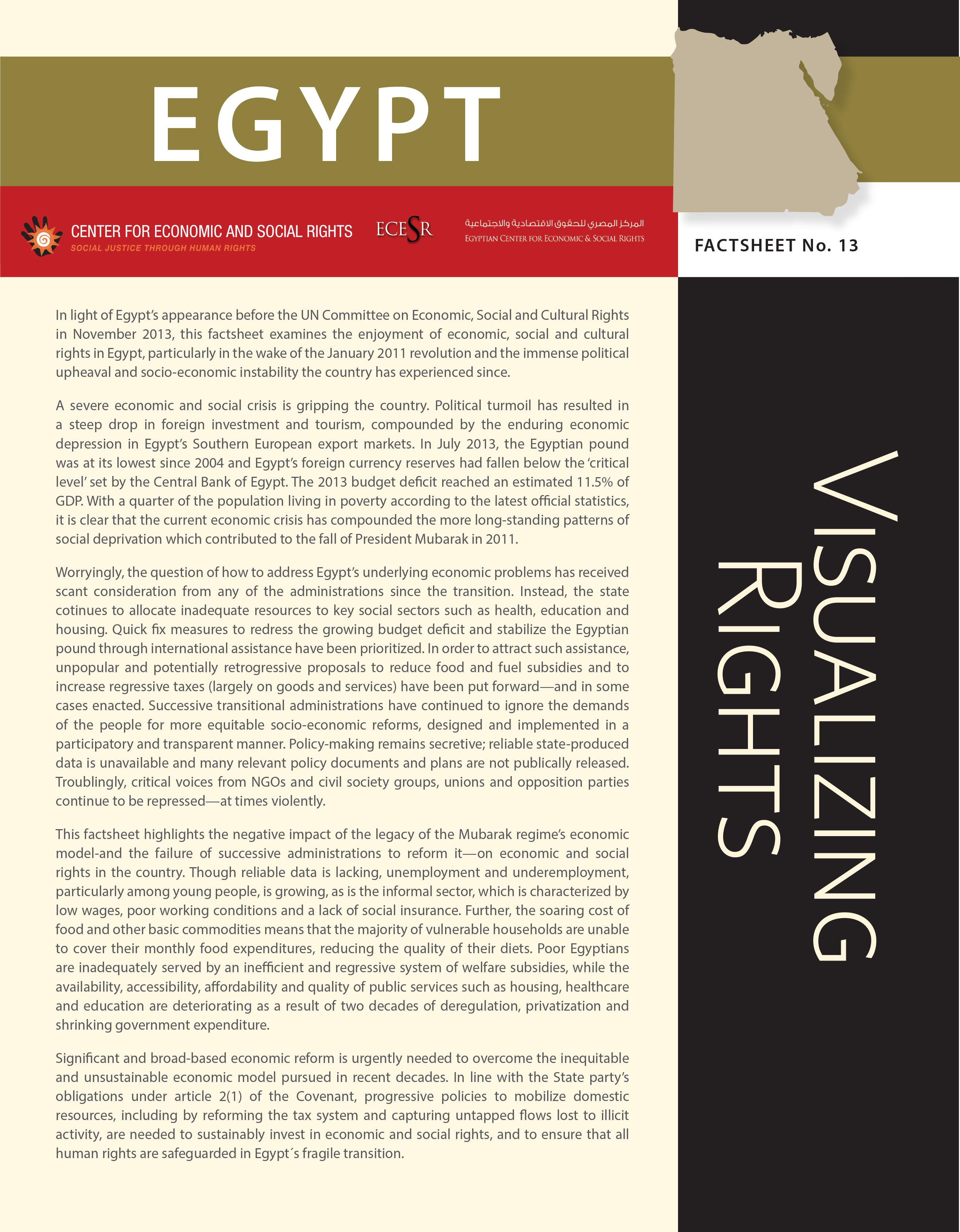 A factsheet produced by CESR in collaboration with the Cairo-based Egyptian Center for Economic and Social Rights (ECESR) provides a concise statistical snapshot of these worrying trends in economic and social rights in the country. This is the latest in the 'Visualizing Rights' series of factsheets, which has become a valued resource highly praised by both advocates and members of UN treaty bodies for effectively translating complex human rights principles and arguments into simple and compelling graphics that support the demands made by people on the ground.